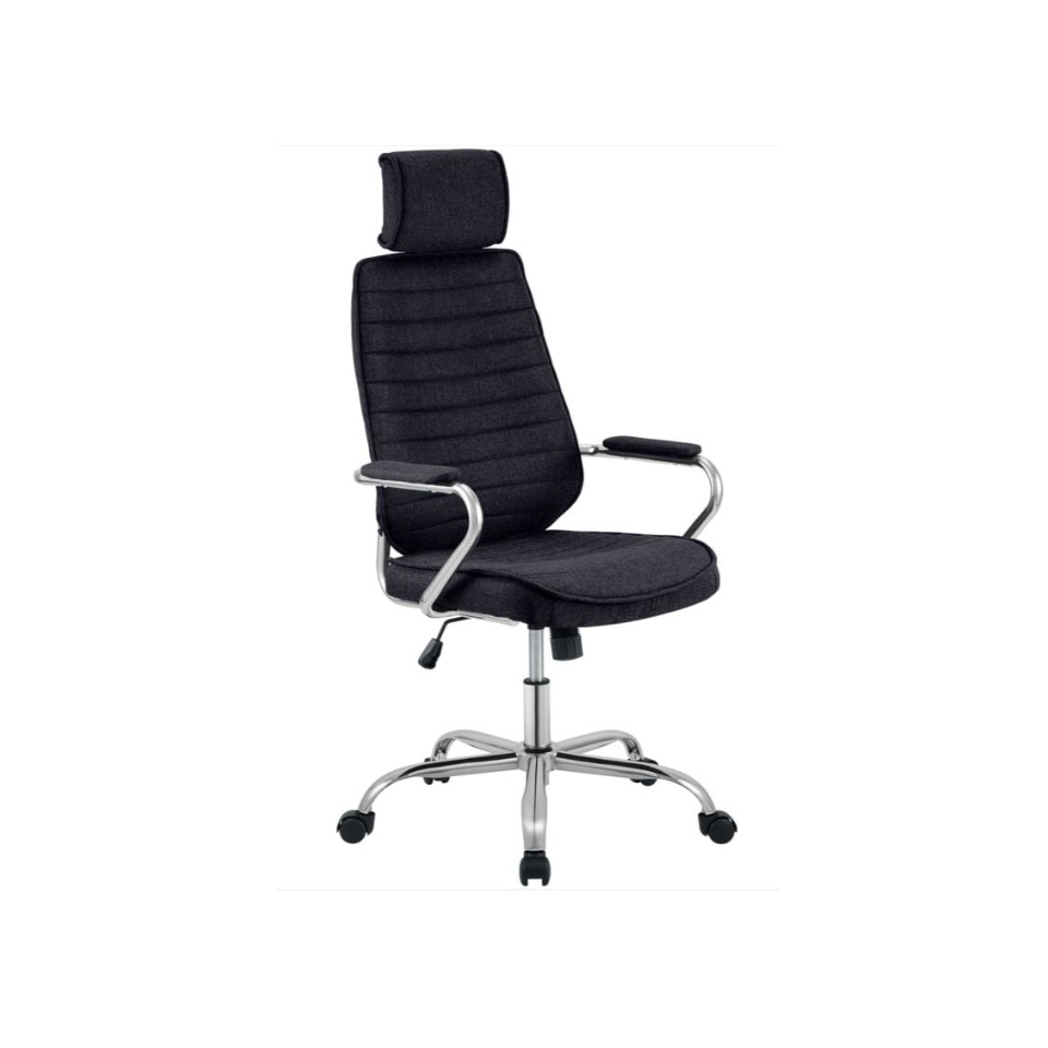 Die Rückenlehne ist ergonomisch geformt und verfügt über eine Kopfstütze. Der stufenlos höhenverstellbare Schreibtischstuhl verfügt über eine Wipp-Mechanik, bei der die Kippspannung variabel eingestellt werden kann. Der Sitz kann aber auch fest arretiert werden.